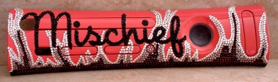 This plate was made for Mischief, who is one of the Frag Dolls. It has hundreds of genuine Swarovski crystals attached to the plate.