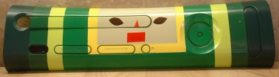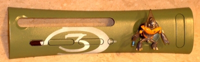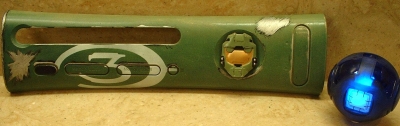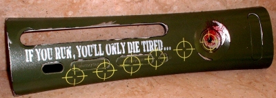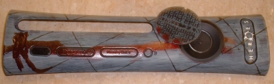This plate includes the owner's gamertag and was painted in a style like the Marvel character Venom. The plate was white, the letters and logo were covered over with stickers, and the webbing was painted on with liquid latex. THe plate was sprayed black and once dry, the stickers were removed and the latex was rolled off with the thumb, leaving the crude webbing.