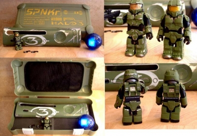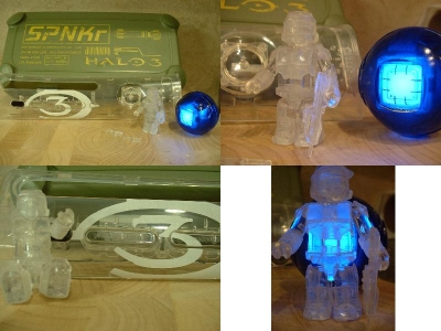 Package included a SPNKR Ammo box that held a custom clear Halo 3 plate, a battle-damaged active camouflage Spartan Kubrick, and a
