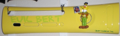 Inspired by the infective Internet joke, painting Muppet Bert as a bad guy. He has drawn a red moustache on a picture of Mother Teresa, the cad! The plate is autographed by Dino Ignacio, creator of the original