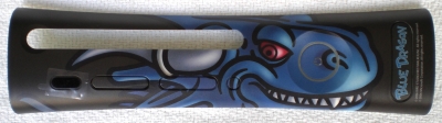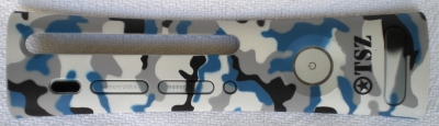 This is made by Pelican and has a white, black and blue camouflage design. This plate and the brown camo plate are made from a different plastic than other plates. It has a waxy feel to it.