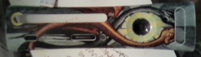 This is a custom airbrushed faceplate featuring two serpents wrapped around a large eye. the creator is unknown. The image was found on Flickr.