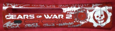 This plate was made for the Gears 2 launch at the Citywalk in Los Angeles. The plate was signed by Cliff Blezsinski, six main voice actors and two other contributors to the game's development.